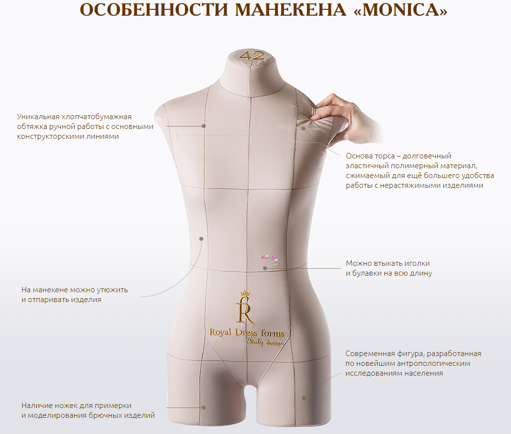 Манекен Monica рассчитан на моделирование женской одежды с пропорциями, отвечающими стандартам современной моды. Он влагоустойчив и выдерживает высокие температуры при утюжке и отпаривании вещей. Сжатие, сдавливание и посадка по фигуре трудно растяжимых материалов не приводят к деформации манекена. Булавки легко входят в мягкую поверхность на полную длину под любым углом.