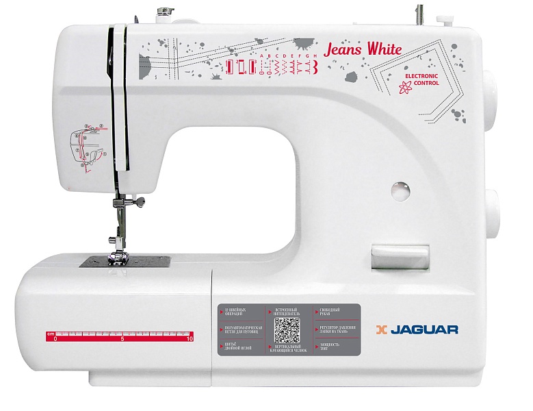 Мощная бытовая электромеханическая швейная машина Jaguar Jeans White с привычным и традиционным вертикальным челноком, удобным встроенным нитевдевателем. Для работы с плотными и тяжелыми тканями предусмотрен регулятор давления лапки на ткань. Узкие изделия, такие как манжеты рукавов или брючин, удобно шить на свободном рукаве. В отсеке съёмного столика хранятся аксессуары. С помощью штопальной пластины и специальной лапки можно пришивать пуговицы.